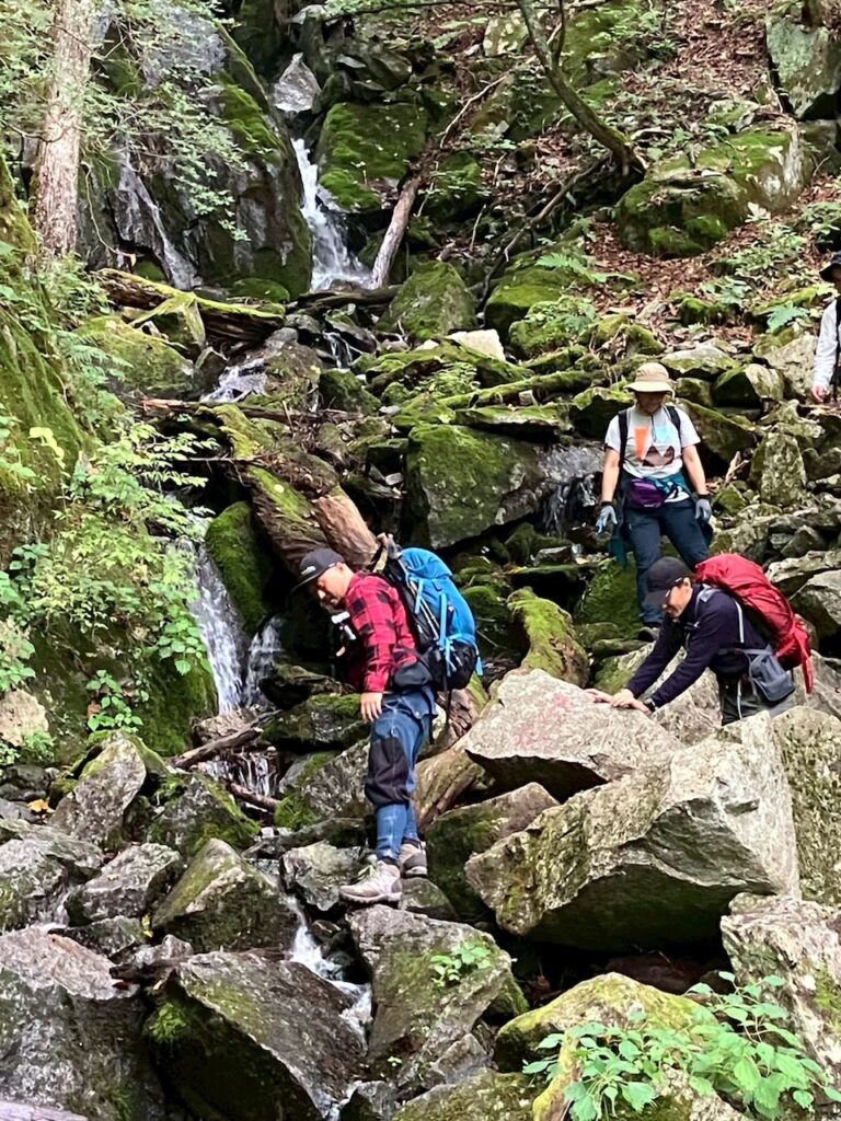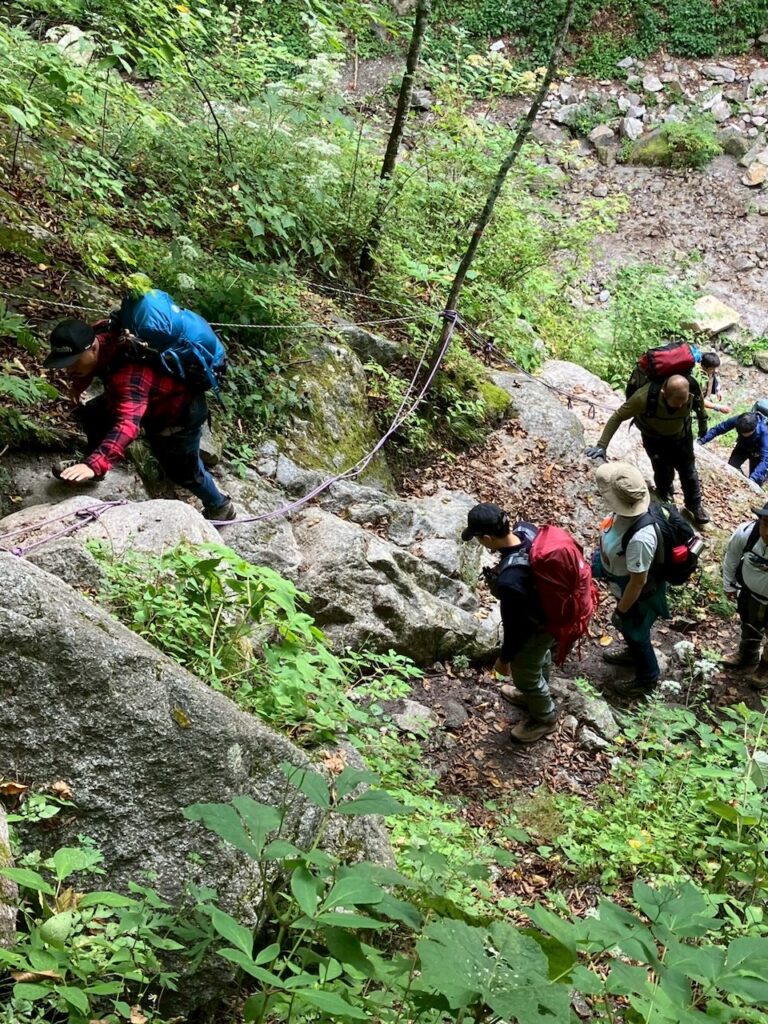 登山チームは、我らが東京都支部にあり元ロッククライマーの池田功隊長をリーダーに、上野さん、茶庭師として名高い金綱造園事務所の金綱重治さんをはじめ、そのお弟子さんたちや都支部会員、一般の方々含め、総勢13名が集まりました。